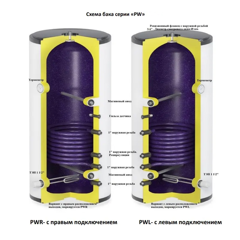 Бак серии «РW» улучшает гибкость системы ГВС, позволяя Вам аккумулировать постоянный объем горячей воды, использовать рециркуляцию ГВС для повышения комфорта пользования. А возможность подключения электрического нагревателя в отверстие с внутренней резьбой 1 1/2 в нижней части бака, делает бак более универсальным.