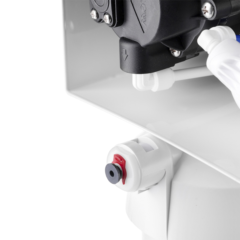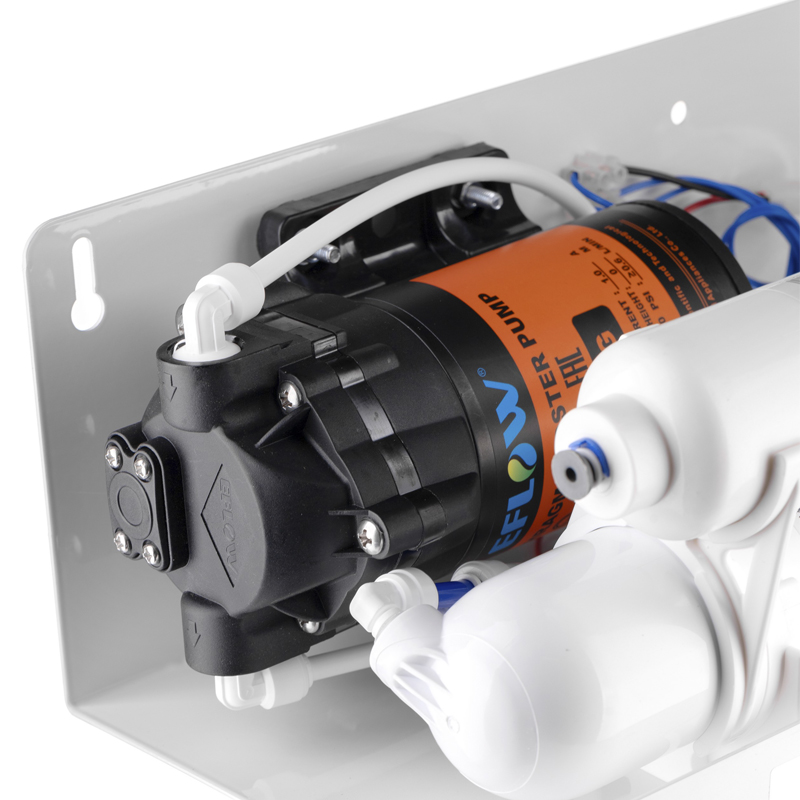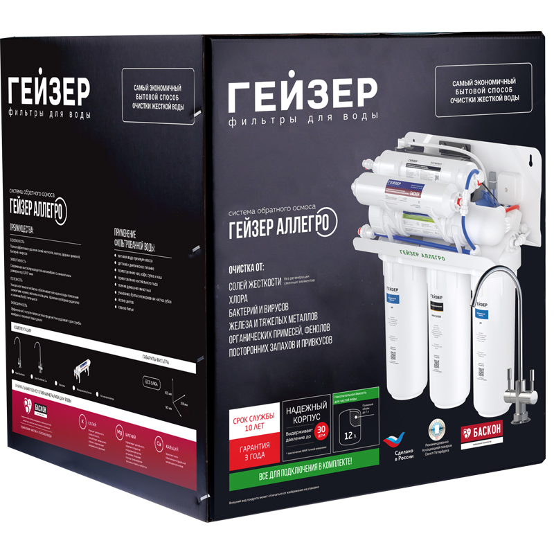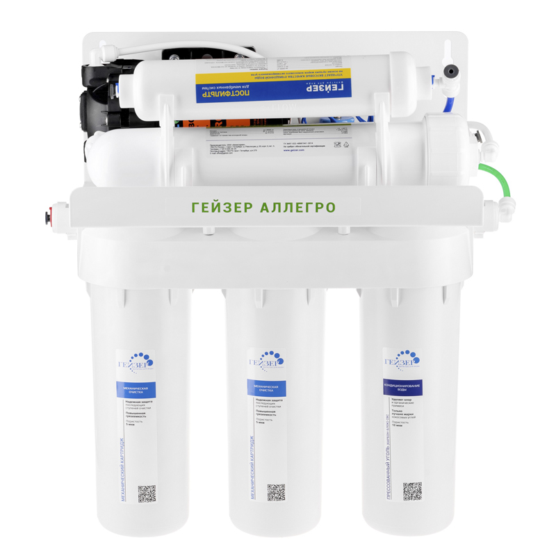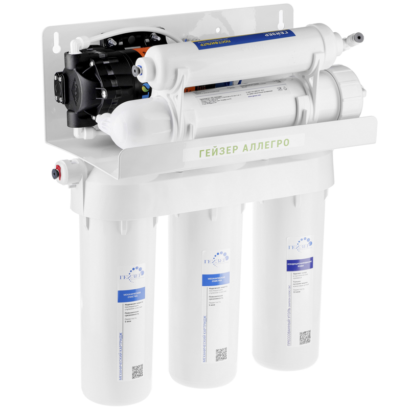 Технология обратного осмоса, использованная в фильтре Гейзер Аллегро П, заключается в фильтрации воды через полупроницаемую мембрану. Размеры пор мембраны настолько малы, что пропускают только молекулы воды. Размер молекул большинства примесей, а также бактерий и вирусов значительно больше молекул воды, поэтому они не проходят через мембрану. Фильтр Гейзер Аллегро П работает при давлении в подводящей магистрали от 0,5 атм. Устройство повышения давления, входящее в комплект, повысит уровень давления до 3-6 атм.