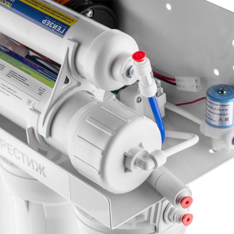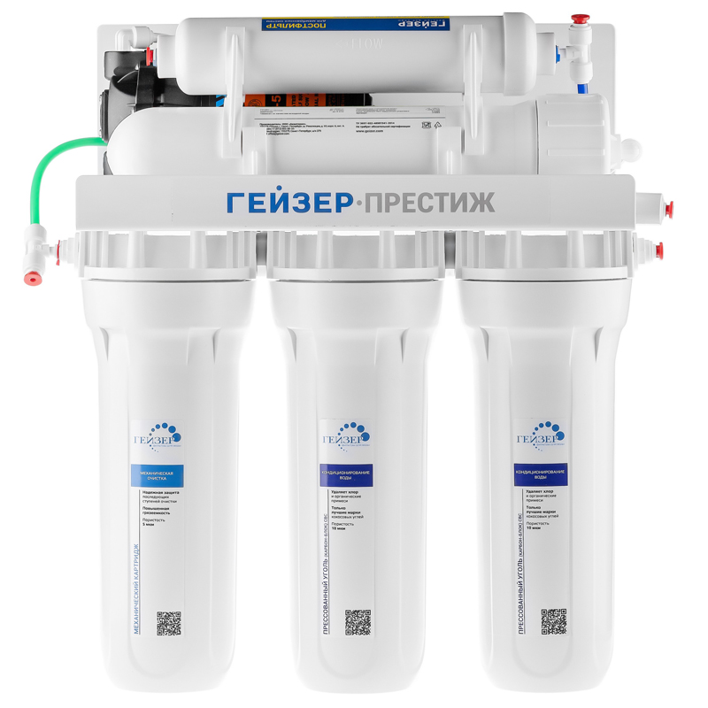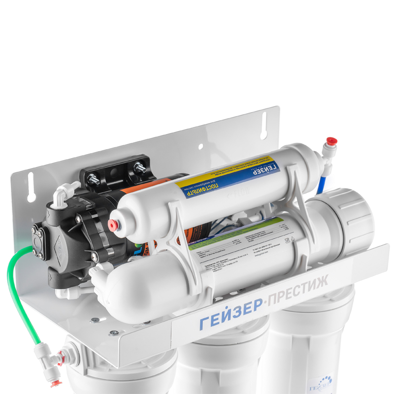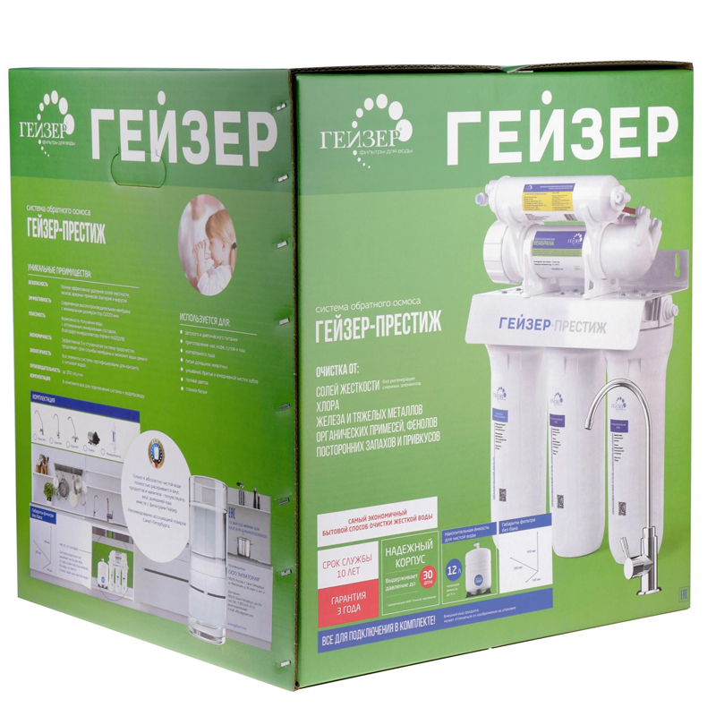 Технология обратного осмоса, использованная в фильтре Гейзер Престиж, заключается в фильтрации воды через полупроницаемую мембрану. Размеры пор мембраны настолько малы, что пропускают только молекулы воды. Размер молекул большинства примесей, а также бактерий и вирусов значительно больше молекул воды, поэтому они не проходят через мембрану. Фильтр Гейзер Престиж П работает при давлении в подводящей магистрали от 0,5 атм. Устройство повышения давления, входящее в комплект, повысит уровень давления до 3-6 атм.
