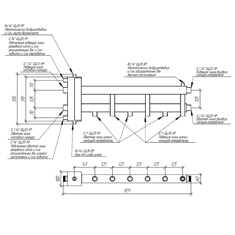 GIDRUSS Коллектор с гидрострелкой BMSS-100-4D (100 кВт, вх. 1 1/4", 3+1 вых. 1 1/4")