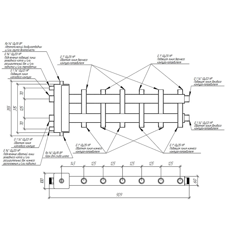 GIDRUSS Коллектор с гидрострелкой BMSS-100-7DU (до 100 кВт, вх. 1 1/4", 3+3+1 вых. 1 1/4")