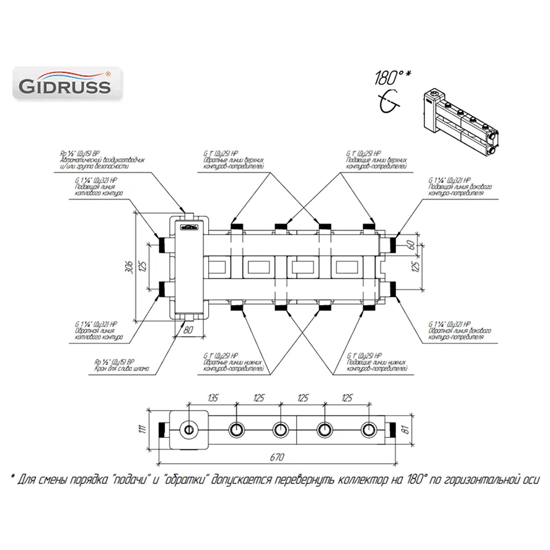 GIDRUSS Коллектор с гидрострелкой BMSS-80-5DU (80 кВт, вх. 1 1/4", 2+2+1 вых. 1")