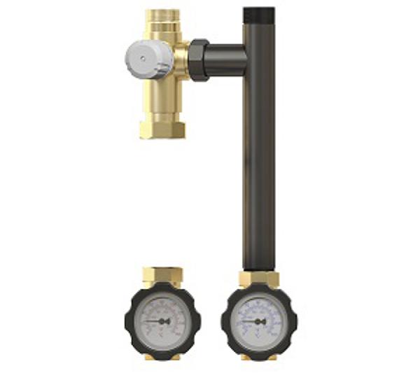 Группа с термостатическим клапаном предназначена для обеспечения циркуляции и поддержания постоянной заданной температуры теплоносителя в контуре потребителя, например, в контуре теплого пола, за счет подмеса холодного теплоносителя из обратной линии контура потребителя.