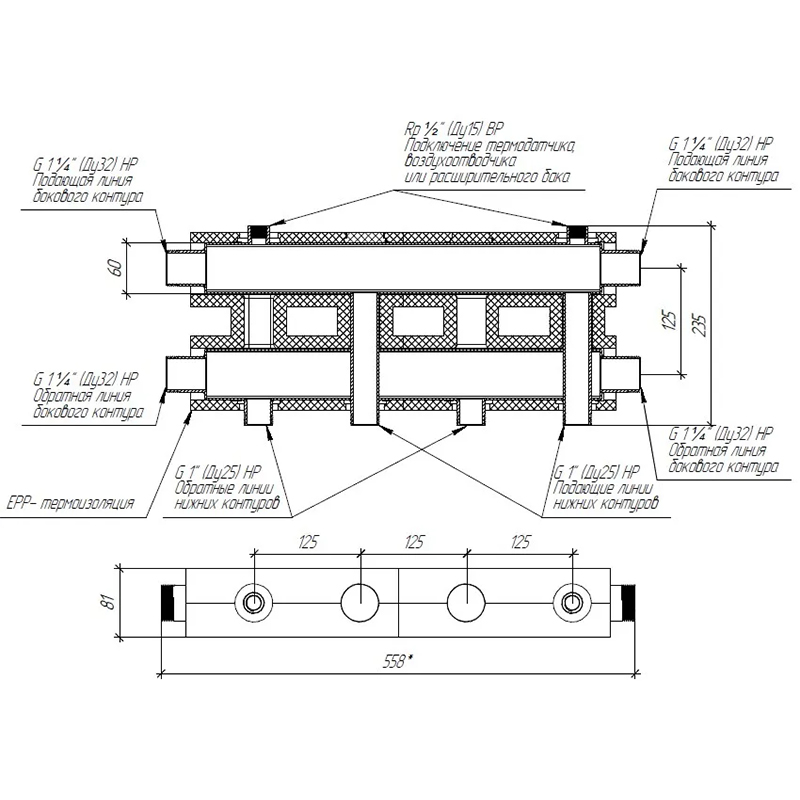 GIDRUSS Распределительный коллектор MKSS-100-2 (100 кВт, вх. 1 1/4", 1+1 вых. 1")