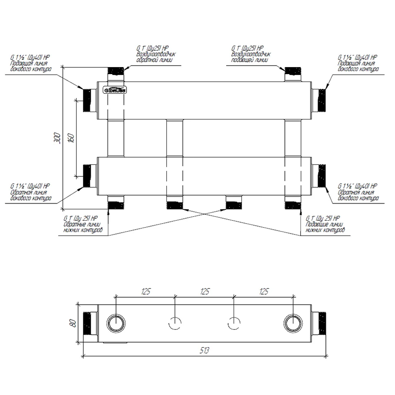 GIDRUSS Распределительный коллектор MKSS-150-2x25 (150 кВт, вх. 1 1/2", вых. 1")