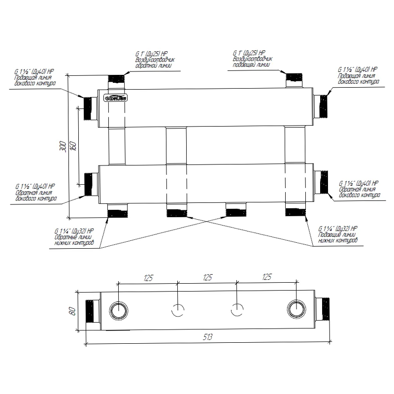 GIDRUSS Распределительный коллектор MKSS-150-2x32 (150 кВт, вх. 1 1/2", вых. 1")