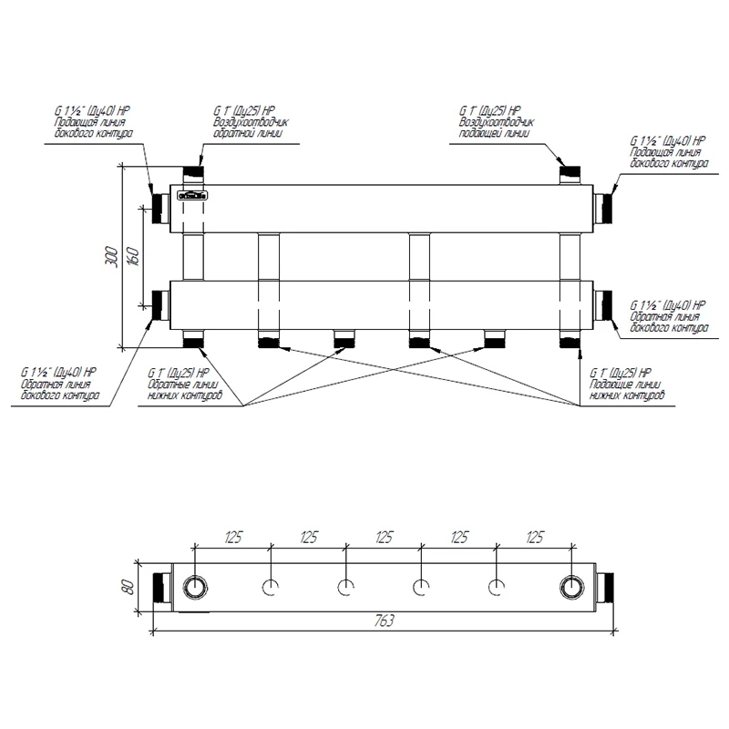 GIDRUSS Распределительный коллектор MKSS-150-3x25 (150 кВт, вх. 1 1/2, вых. 1")