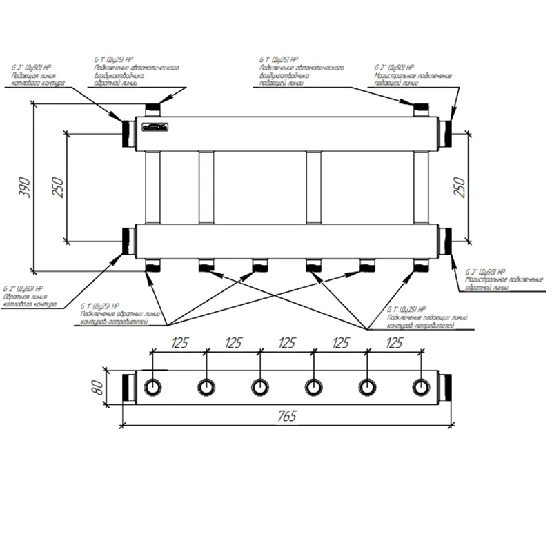 GIDRUSS Распределительный коллектор MKSS-250-3x25 (250 кВт, вх. 2", вых. 1")