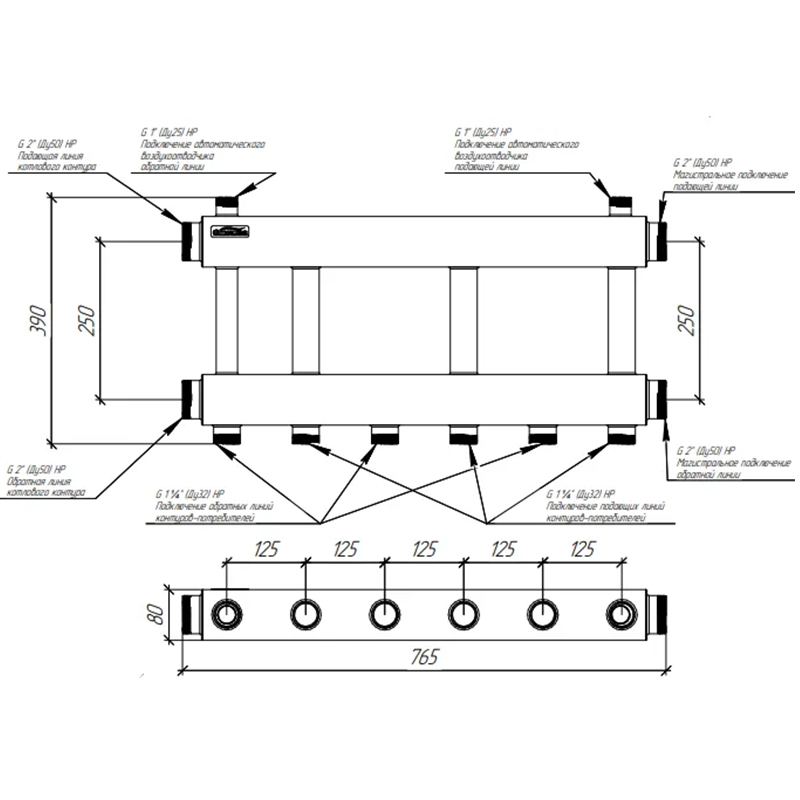 GIDRUSS Распределительный коллектор MKSS-250-3x32 (250 кВт, вх. 2", вых. 1/ 14")