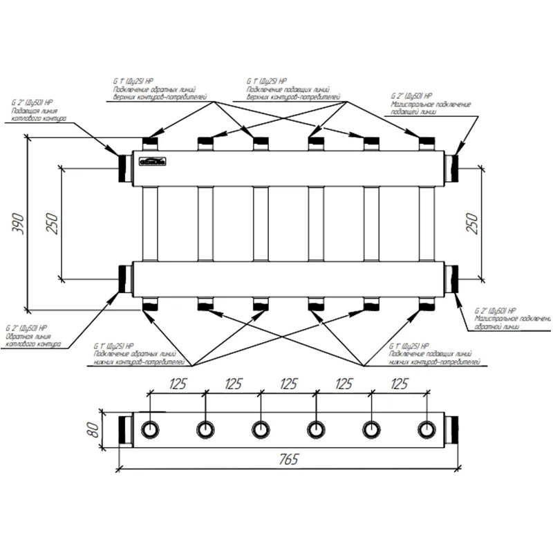 GIDRUSS Распределительный коллектор MKSS-250-6DU (250 кВт, вх. 2", 3+3 вых. 1")