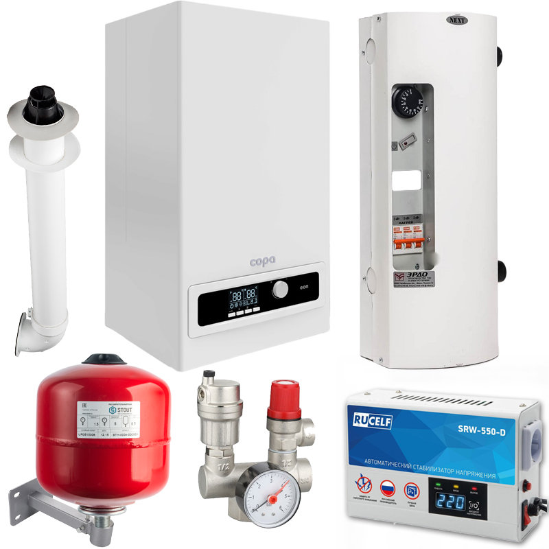 Пакет № 1 Газовый котел Сора EON 24 + Электрокотел ЭВПМ 12 квт + ВСЯ ОБВЯЗКА