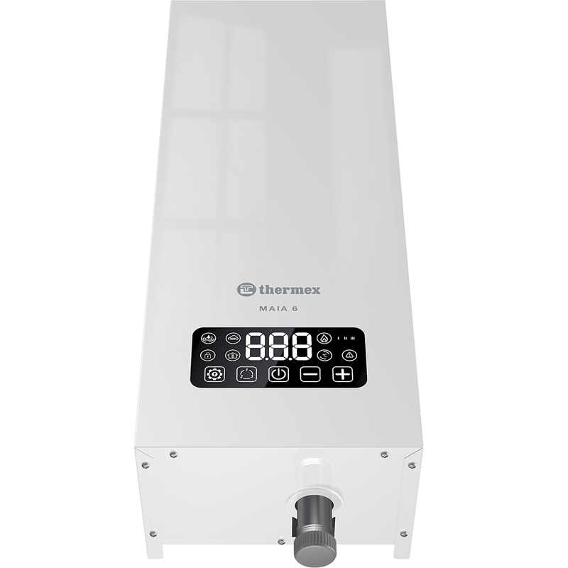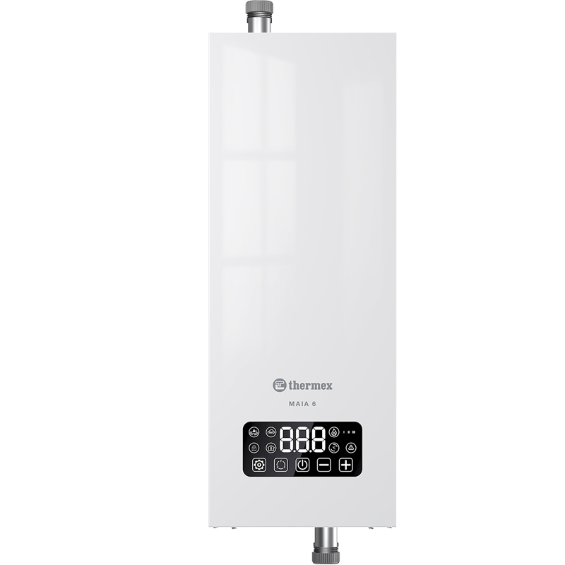 - Система безопасности. Thermex Maia 6 объединил одни из самых востребованных критериев современной техники. Среди них – многоуровневая система безопасности: защита от перегрева с помощью термопредохранителя на 105 °С, «Антизамерзание», «Защита от детей» – блокировка панели управления от случайных касаний, а также режим самодиагностики для постоянного мониторинга ошибок в работе котла. Помимо этого, Thermex Maia 6 имеет I класс электрозащиты.