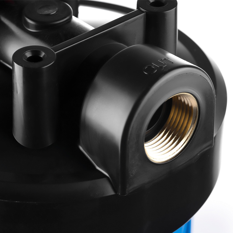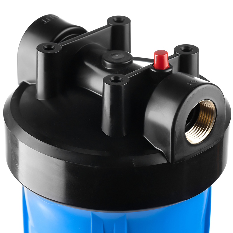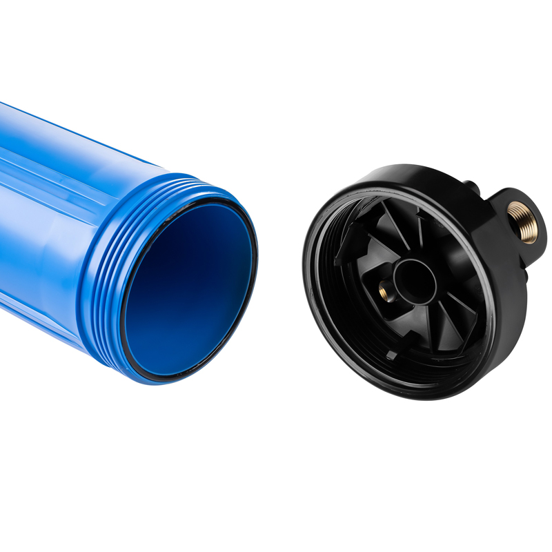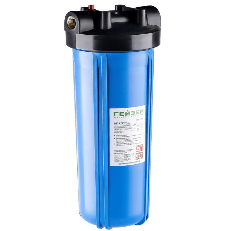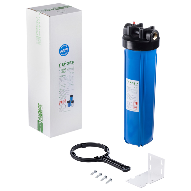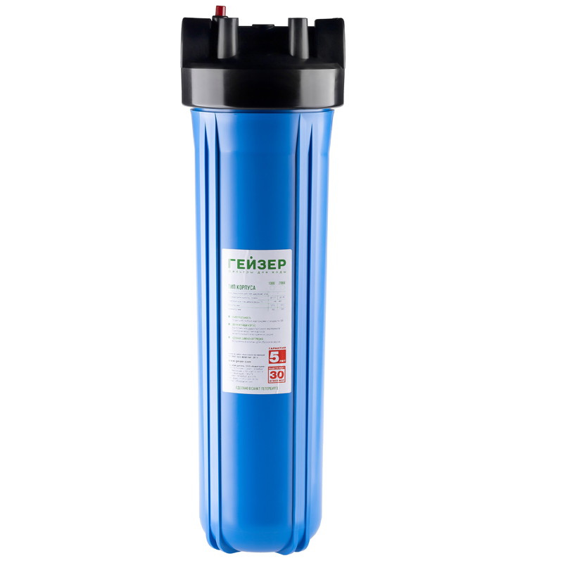 Корпус Гейзер 20BB изготовлен из синего полипропилена; крышка корпуса – черный полипропилен с латунными вставками. Корпус рассчитан на работу под давлением и установку на входе в систему холодного водоснабжения. В производстве корпусов используется только первичное сырье пищевого класса.