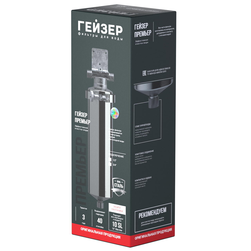 Гейзер-Премьер 10SL 1/2" устанавливается на вход в систему горячего или холодного водоснабжения. Корпус фильтра изготовлен из высококачественной нержавеющей стали марки 304L, устойчивой к возникновению коррозии, что гарантирует высокую надежность и многолетнюю работу фильтра.