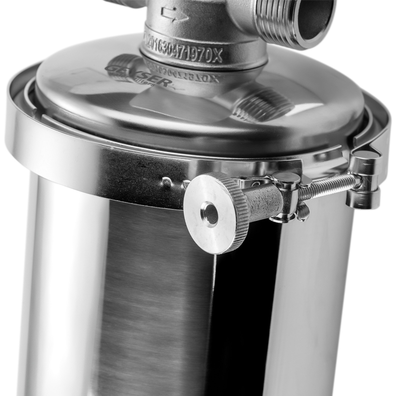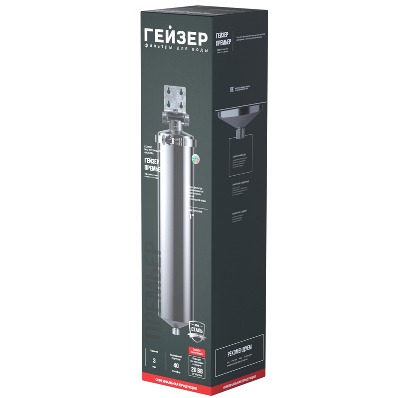 Гейзер-Премьер 20BB 1" легко подключается к магистрали и легко обслуживается. Хомутовое крепление крышки позволяет легко извлечь картридж без использования дополнительных ключей. Также для замены картриджа предусмотрено удобное отверстие для слива воды.