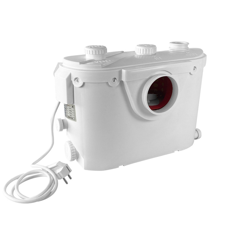 Имеет четыре входа: один вход – для присоединения к унитазу и три входа– для присоединения других сантехнических приборов. Сточные воды отводятся в канализацию через выходное отверстие. В станции предусмотрены обратный клапан, встроенный блок автоматики, двигатель с термозащитой, угольный фильтр.- Артикул VF.KNSI.500.110.04.02