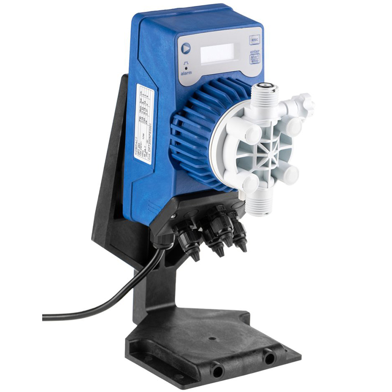 Цифровой дозирующий насос с постоянной производительностью, регулируемой вручную, или дозирование пропорционально внешнему аналоговому (4 ÷ 20 мА или 20 ÷ 4 мА) или цифровому импульсному сигналу (например, от водосчетчика). Программируется с помощью кнопок на передней панели и имеет 2-строчный 8-символьный дисплей с подсветкой. Насосная головка оснащена ручным клапаном закачки. Производительность насоса регулируется вручную или автоматически (по входному сигналу) от 0 (останов насоса) до 100% от максимальной производительности. Оснащен сигнализацией низкого уровня