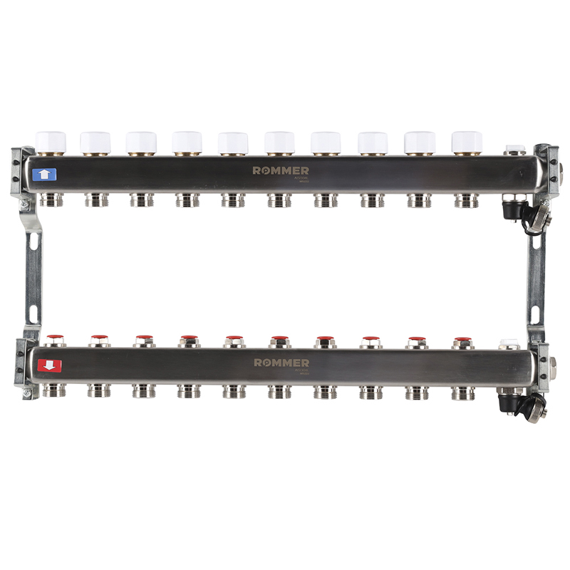 Коллекторная группа ROMMER из нерж. стали без расходомеров 10 выходов (с краном маевского и сливом)