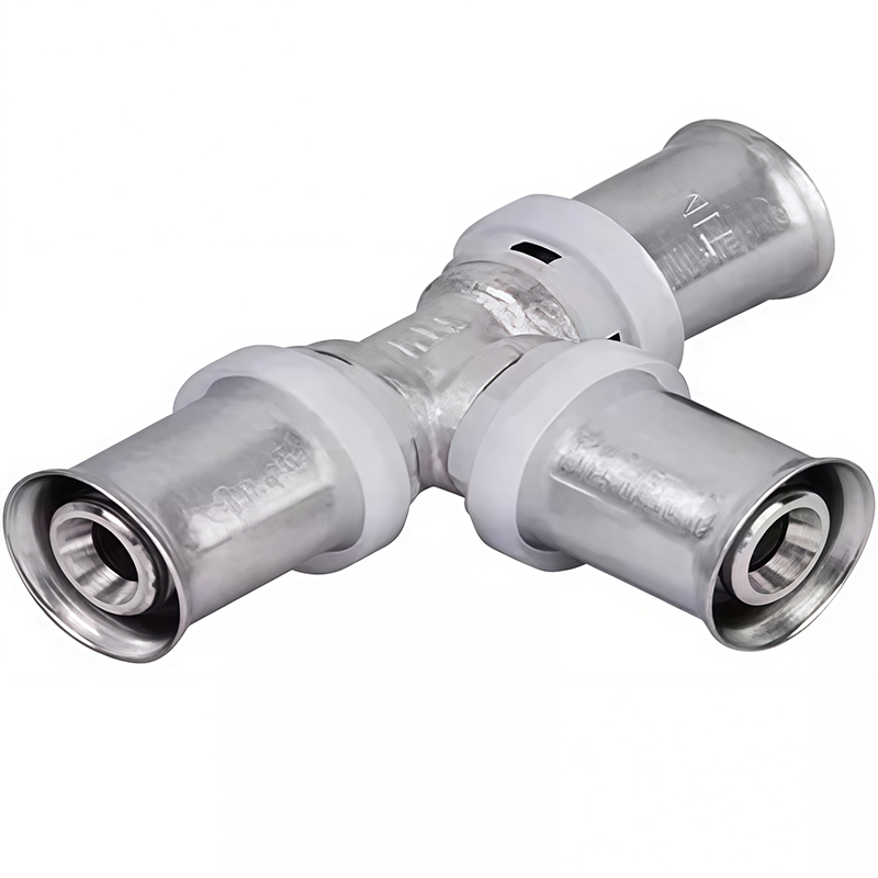 Пресс-тройник предназначен для создания неразъемного соединения металлополимерных труб одного диаметра. Материал фитинга - латунь. Срок службы соединения составляет более 50 лет.