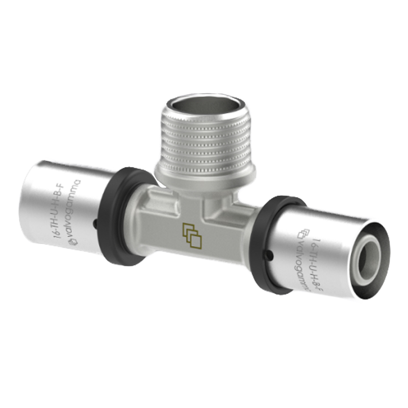 Пресс фитинг – тройник с переходом на наружную резьбу пресс системы VALVOGAMMA предназначен для подсоединения к металлополимерной трубе VALVOGAMMA PE-Xb/AL/PE-Xb элемента системы с внутренней резьбой. Корпус фитинга горячепрессованная, никелированная латунь CW617N. Материал пресс-гильзы – нержавеющая сталь AISI 304. Уплотнительный материал на штуцере (два кольца) – EPDM Perox, материал изолятора – нейлон. Резьба – трубная, класс точности "В", имеет насечки для наилучшего удержания уплотнительного материала при монтаже.