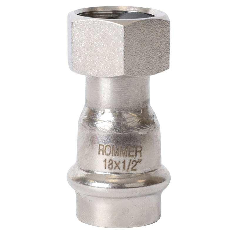 Пресс муфта с накидной гайкой Rommer из нержавеющей стали (RSS-0026) применяется для организации систем отопления и водоснабжения в квартирах и частных домах. Производится из нержавеющей стали марки SUS 304. Непрессованное соединение не герметично за счет специальной формы уплотнительного EPDM-кольца.