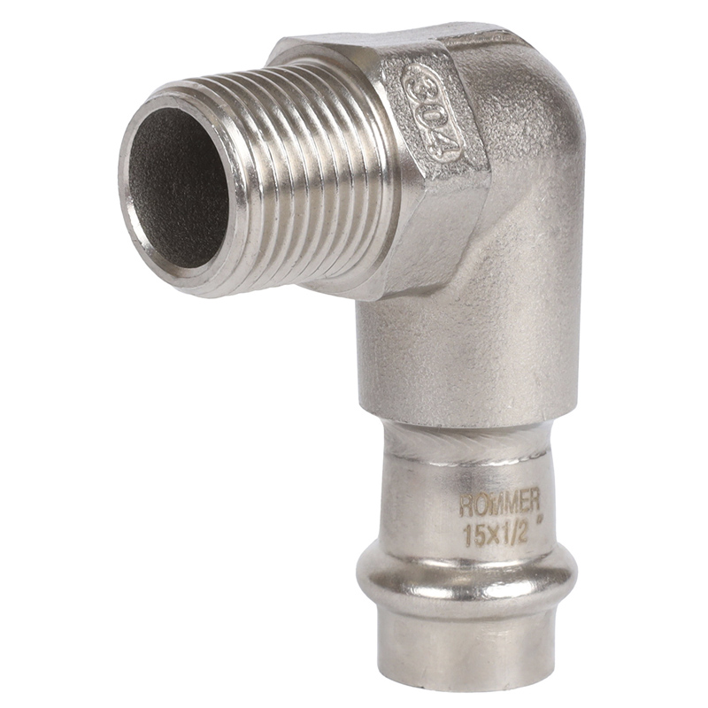 Пресс угольник Rommer из нержавеющей стали (RSS-0010) применяется для организации систем отопления и водоснабжения в квартирах и частных домах. Производится из нержавеющей стали марки SUS 304. Непрессованное соединение не герметично за счет специальной формы уплотнительного EPDM-кольца.
