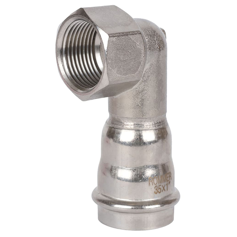 Пресс угольник Rommer из нержавеющей стали (RSS-0009) применяется для организации систем отопления и водоснабжения в квартирах и частных домах. Производится из нержавеющей стали марки SUS 304. Непрессованное соединение не герметично за счет специальной формы уплотнительного EPDM-кольца.