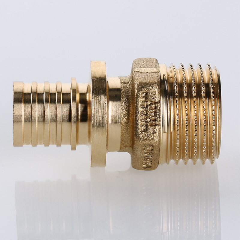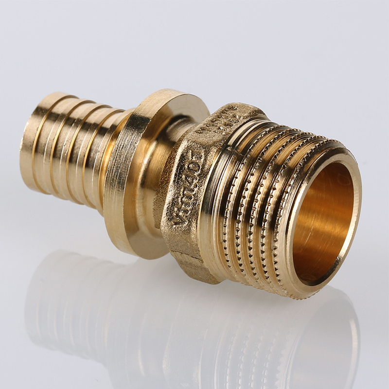 Соединитель VTm.401.BG – прямой латунный надвижной фитинг с переходом на наружную резьбу для труб из сшитого полиэтилена и полиэтилена повышенной термостойкости.