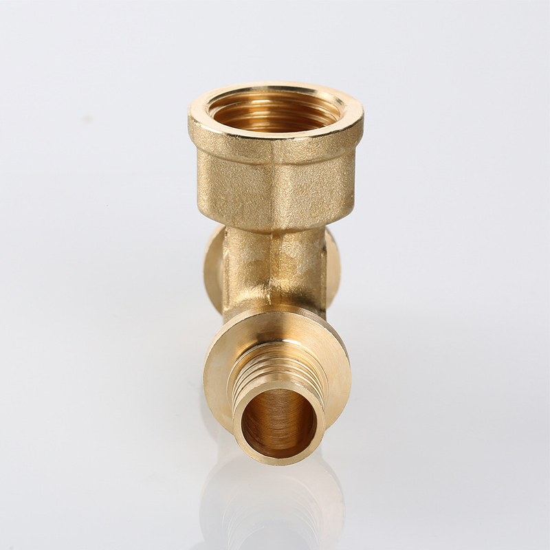 VTm.432.BG – трехсторонний латунный универсальный аксиальный фитинг с переходом на внутреннюю резьбу в центральном отводе, обеспечивающем присоединение к полимерному трубопроводу элемента системы с резьбовым патрубком.