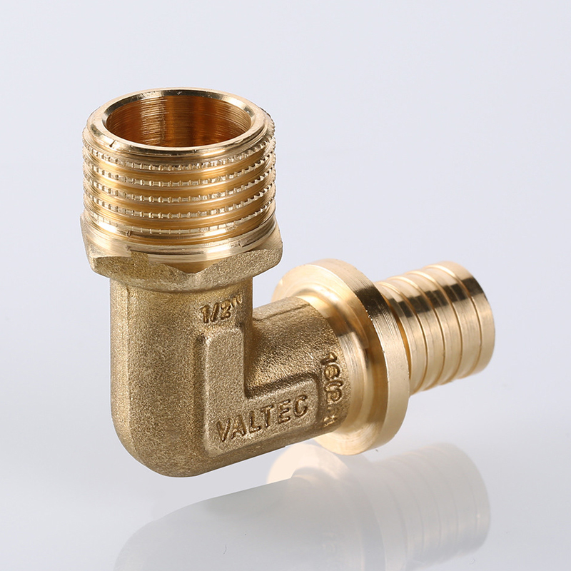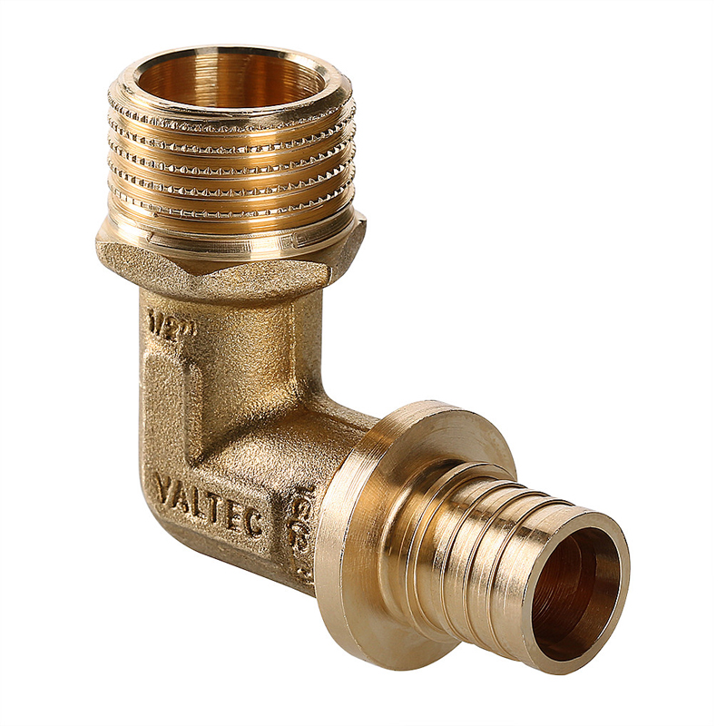 Угольник надвижной VTm.453.BG – латунный универсальный аксиальный фитинг для соединения под углом 90° трубы из PEX или PE-RT с резьбовым элементом трубопровода (резьба фитинга – наружная).