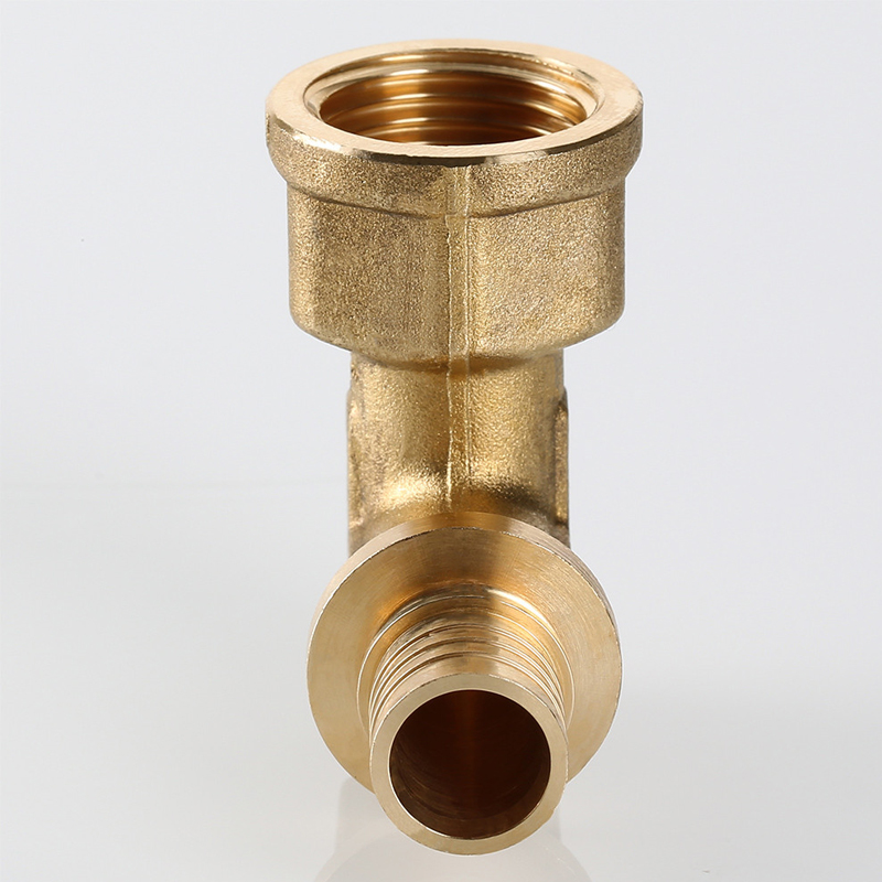 Угольник надвижной VTm.452.BG – латунный универсальный аксиальный фитинг для соединения под углом 90° трубы из PEX или PE-RT с резьбовым элементом трубопровода (резьба фитинга – внутренняя).