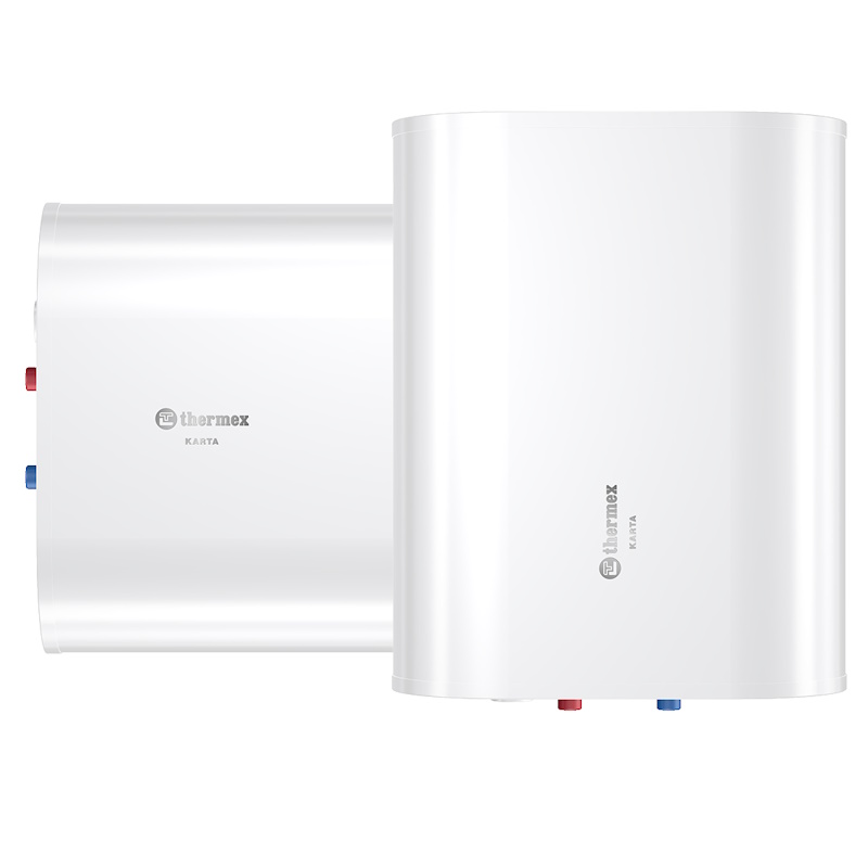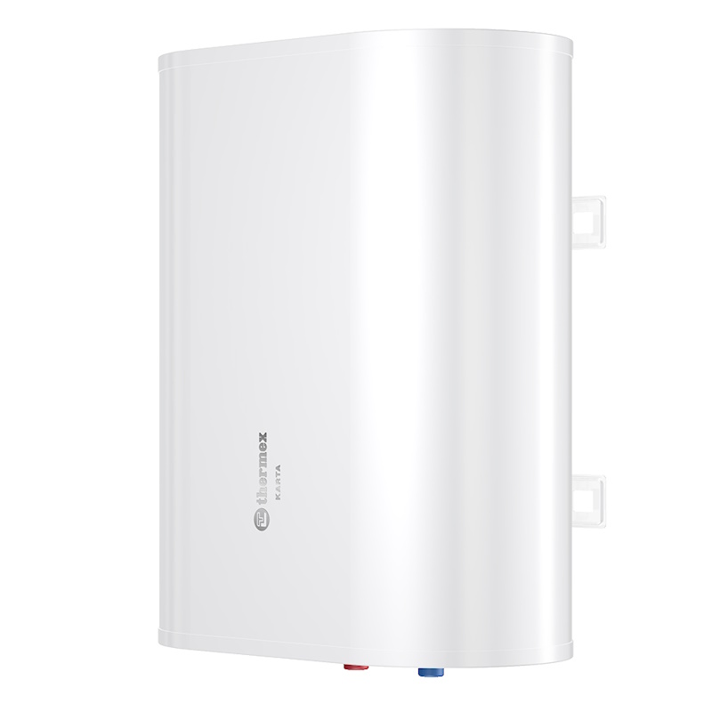 Плоский бак-нагреватель Thermex Karta. Универсальная конструкция может размещаться на стене вертикально или горизонтально, что позволит легко адаптироваться под небольшие свободные пространства. С нижней/боковой стороны расположены индикаторы состояния.
