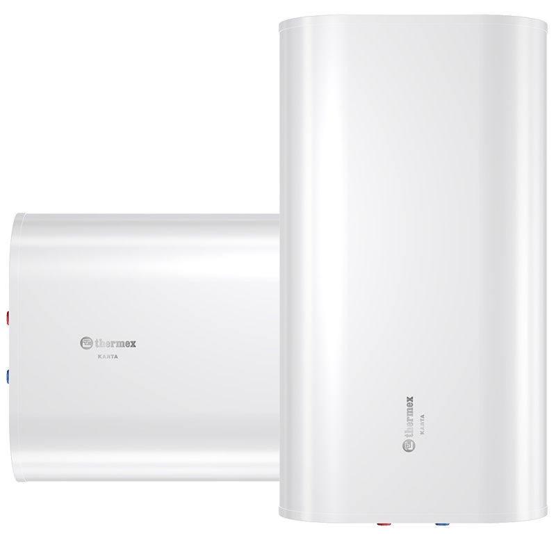 Плоский бак-нагреватель Thermex Karta. Универсальная конструкция может размещаться на стене вертикально или горизонтально, что позволит легко адаптироваться под небольшие свободные пространства. С нижней/боковой стороны расположены индикаторы состояния.